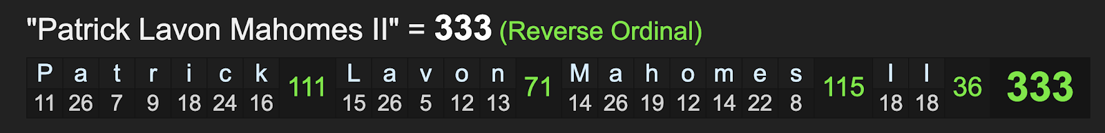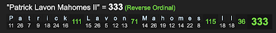 Don’t forget Patrick Mahomes became the 33rd quarterback to win a Super Bowl, and the third black quarterback to do so. Patrick sums to 33, and his full name, Patrick Lavon Homes II sums to 333.