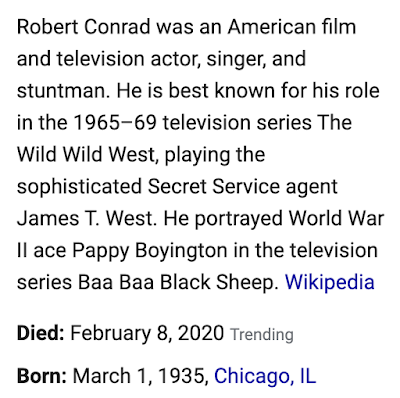 Robert Conrad, TV actor, dead at 84, February 8, 2020