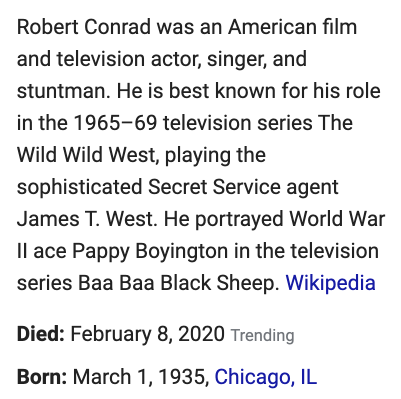 Robert Conrad, TV actor, dead at 84, February 8, 2020