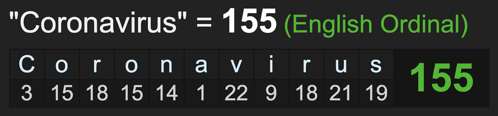 Second, UFC 249 is on Souza’s 155th day of his age.  Of course, coronavirus sums to 155.