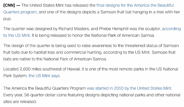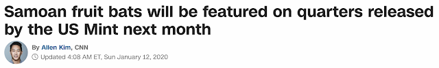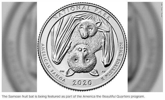 Samoan fruit bat will be featured on quarters released by US mint, January 12, 2020 news +February 3 release