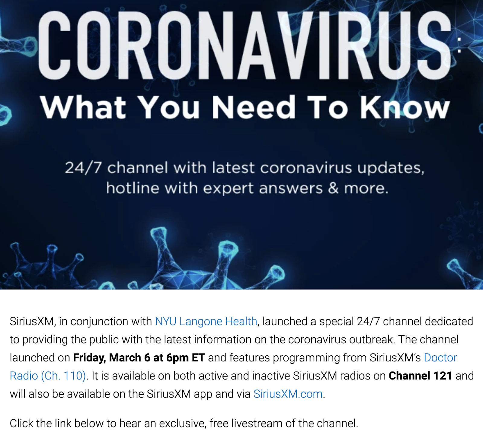 And on March 6, SiriusXM launched channel 121, the coronavirus channel.