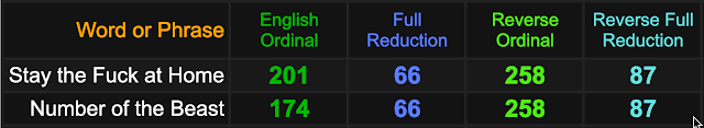 Notice how Stay the Fuck at Home sums to 201, like Event 201, and 66 / 87 / 258 like ‘Number of the Beast’. Of course, ‘corona’ also sums to 66.