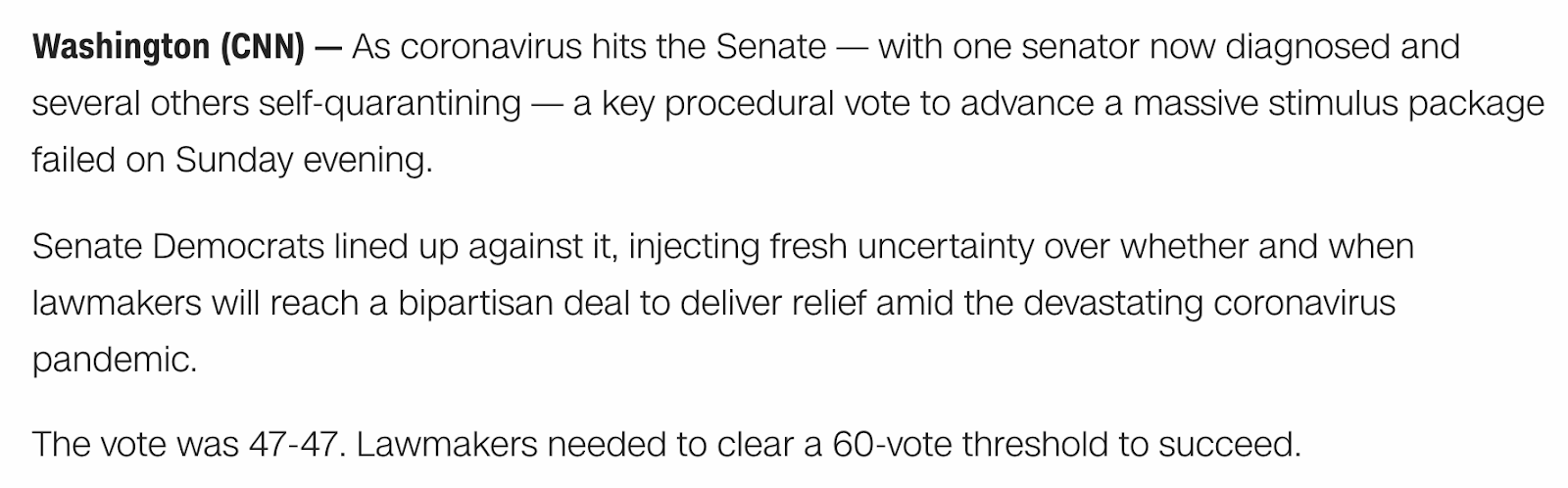Senate procedural vote on coronavirus economic stimulus tied at 47-47 & Dow futures for March 23, 2020 bottom out at 5%, March 22, 2020 news