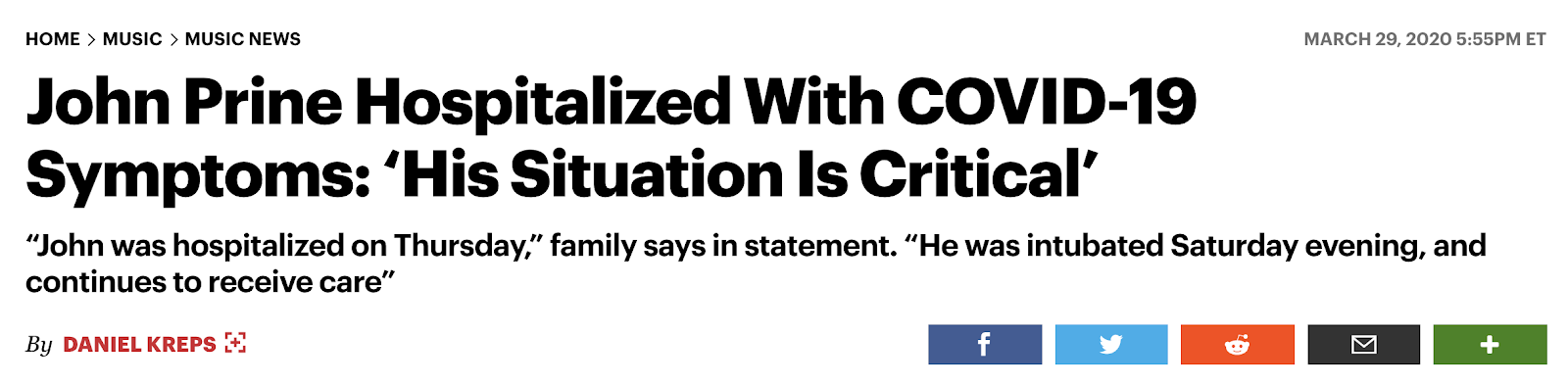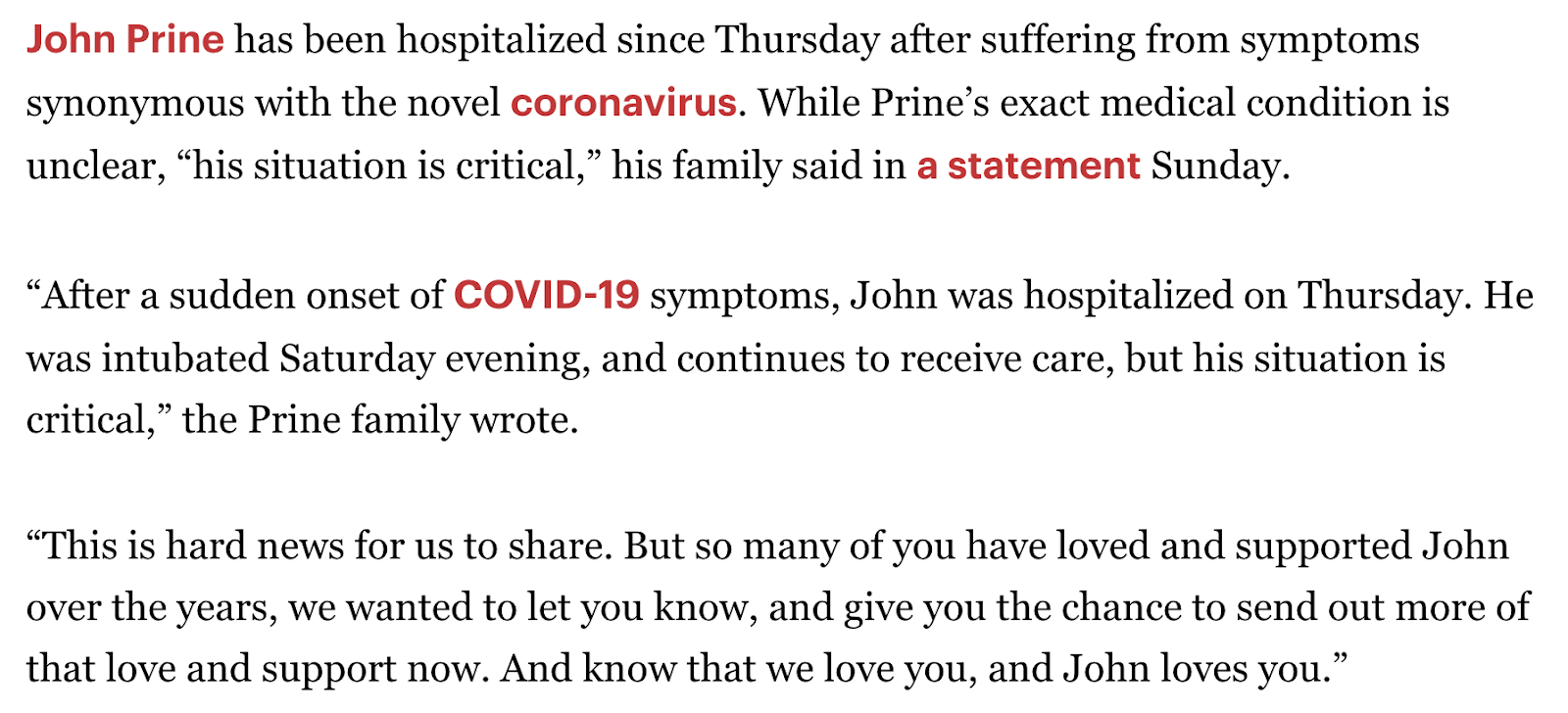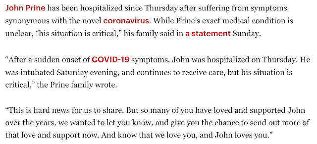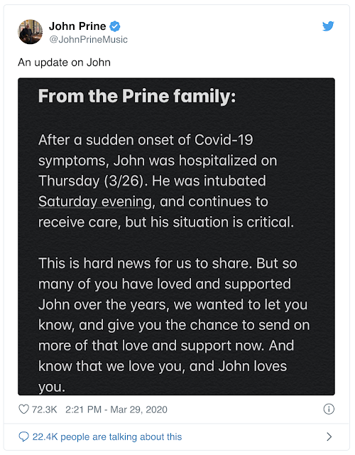 Singer John Prine hospitalized with coronavirus March 26 & in critical condition, Sunday, March 29, 2020
