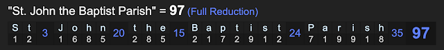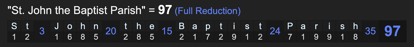 Get that, the name of the location, St. John the Baptist Parish sums to 97, like death, and it has the highest per capita rate of death. I wouldn’t be surprise if the hospitals are run by the “Coffin Family”. Oh yea, and ‘Louisiana’ equates to ‘death’ as well.