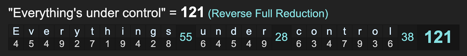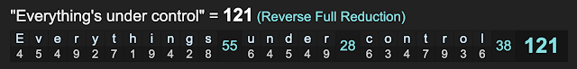 Second, notice the gematria of the phrase ‘Everything’s under control’.
