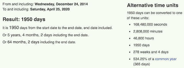 From the release of The Interview, a movie about assassinating Kim Jong Un, December 24, 2014, until his reported death, April 25, 2020, was a span of 1950-days.