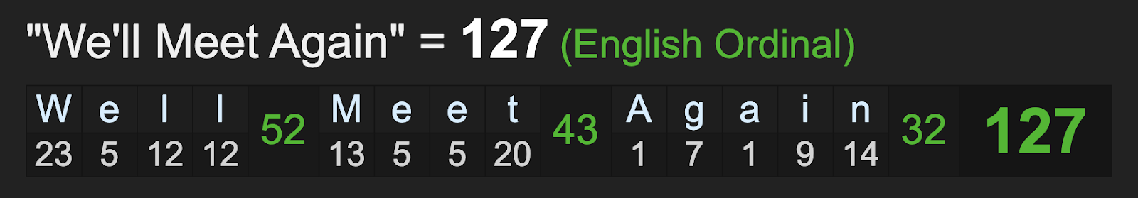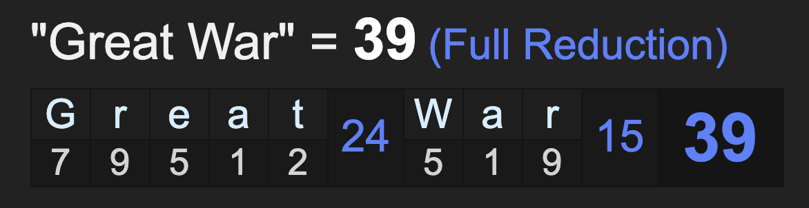 Notice how Vera Lynn sums to 39, going with her 1939 song, the year World War II began, the continuation of the ‘Great War’.