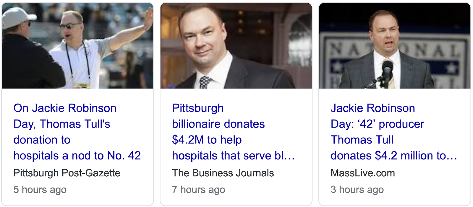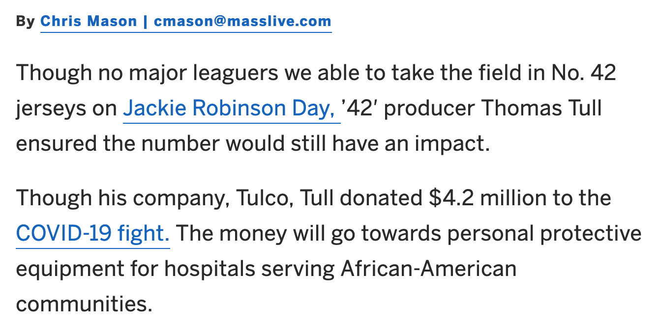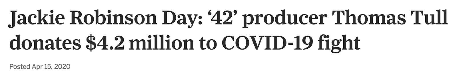 Thomas Tull, ’42’ producer (Jackie Robinson film), makes $4.2 million donation to COVID-19 fight, April 15, 2020