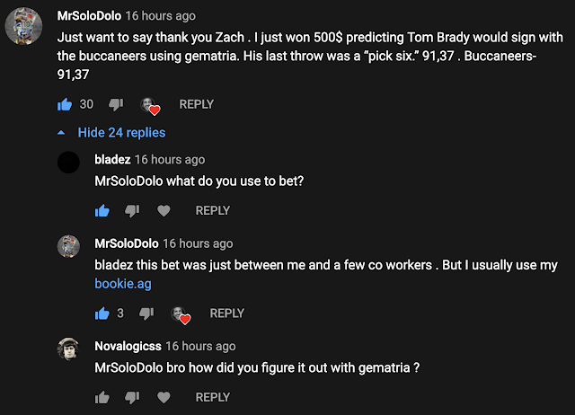 On March 16, or 3/16, the Buccaneers inquired about Tom Brady, and the next day they had him. Notice how in Gematria, Tampa Bay Buccaneers sums to 316, like the date the process began.
