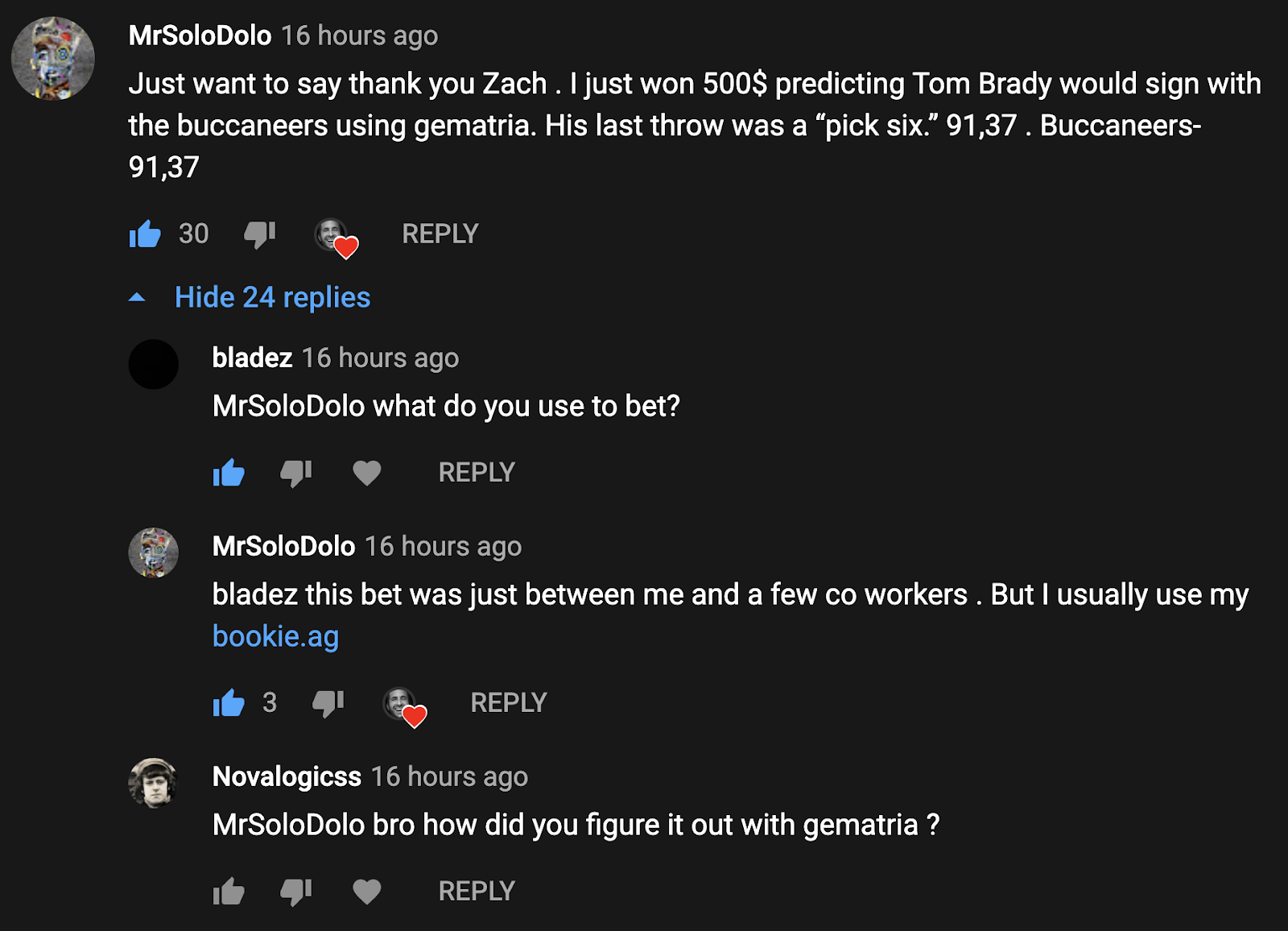 On March 16, or 3/16, the Buccaneers inquired about Tom Brady, and the next day they had him. Notice how in Gematria, Tampa Bay Buccaneers sums to 316, like the date the process began.