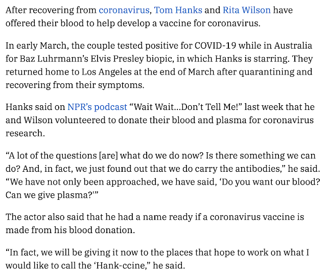 Tom Hanks & wife donate blood towards coronavirus / COVID-19 vaccine, April 25, 2020 news