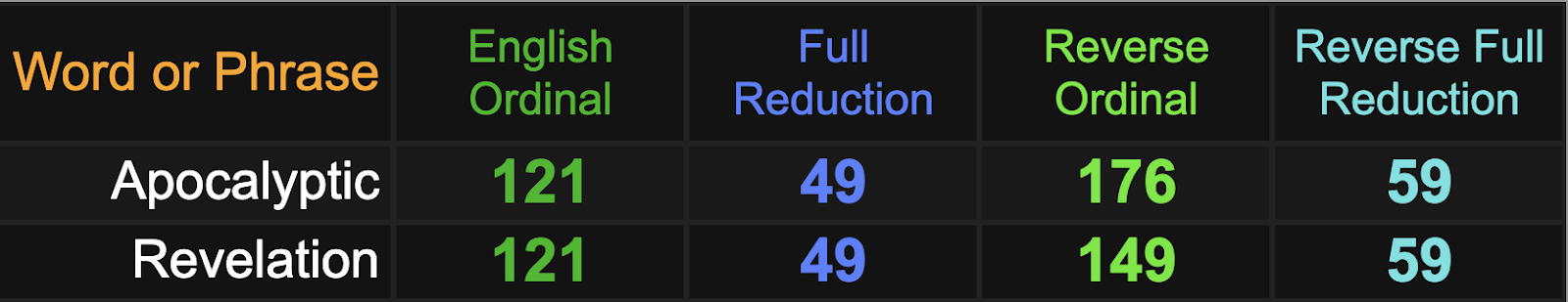 And recall what ‘apocalyptic’ and ‘Revelation’ have to do with the first case being confirmed in the U.S. on January 21, or 1/21, like 121.
