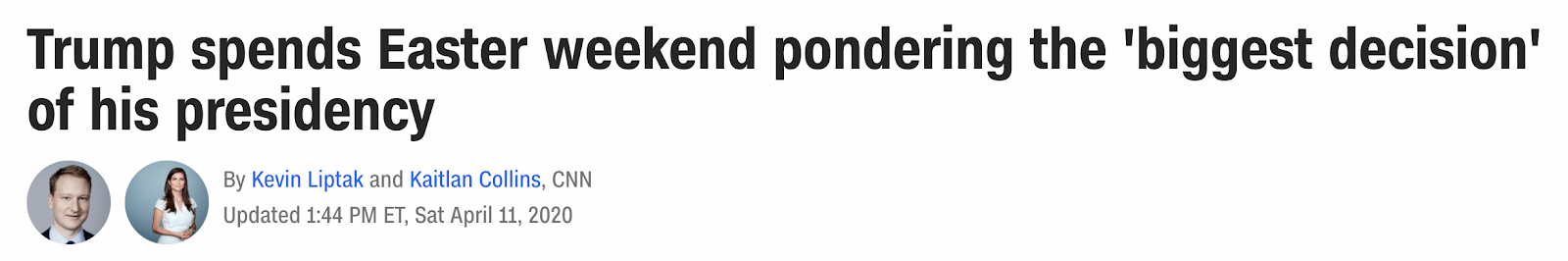 His biggest decision has to do with bringing the economy back to life, and he is mulling this on Easter weekend, when Christians are celebrating the resurrection of Jesus.