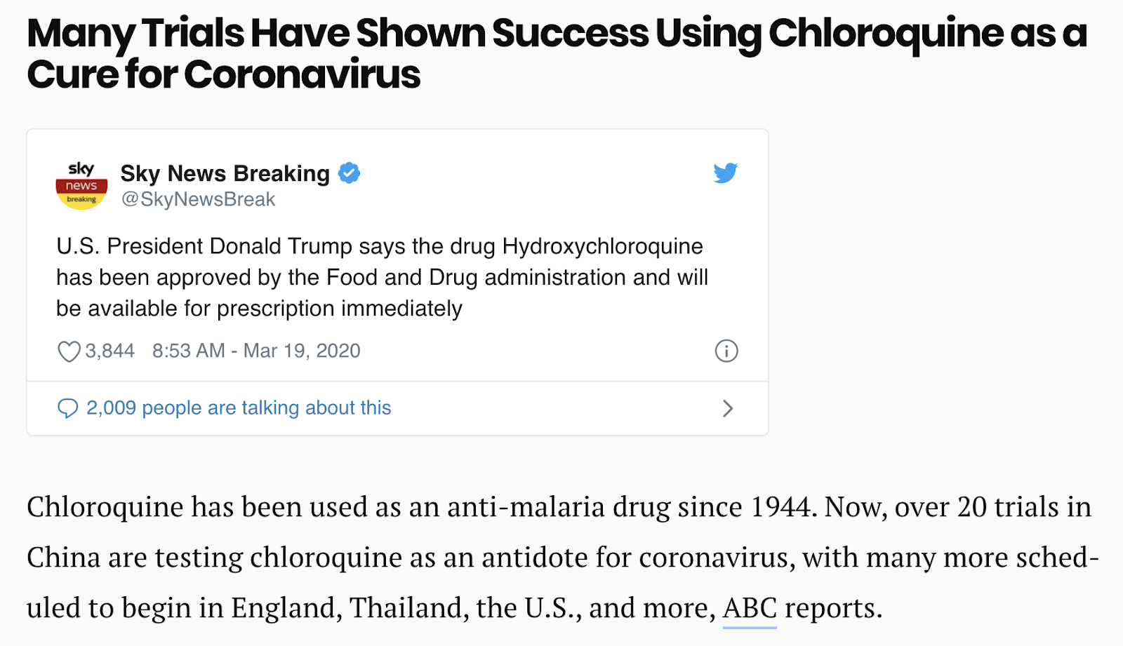 Trump suggests malaria drug can treat coronavirus, Chloroquine, March 19, 2020