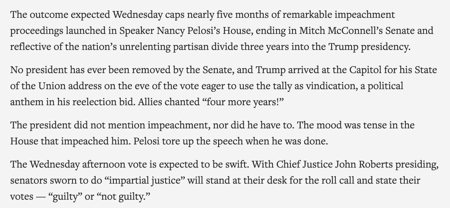 Trump to be acquitted from impeachment, February 5, 2020, by the numbers