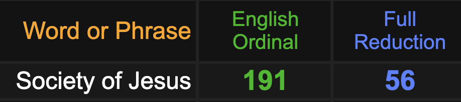 Notice his name sums to 191 as well. Can you say Society of Jesus?