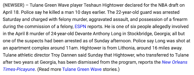 Tulane basketball player Teshaun Hightower charged with murder after declaring for NBA Draft, April 25, 2020