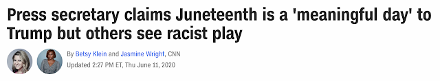 Adding insult to injury, look at CNN’s cover story on this day, Trump and Juneteenth. Of course, this holiday began at the end of the U.S. Civil War, that began in 1861.