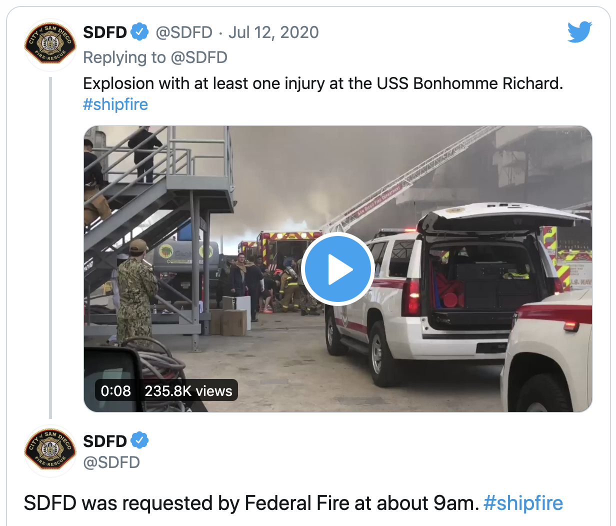 USS Bonhomme Richard suffers explosion in San Diego, July 12, 2020