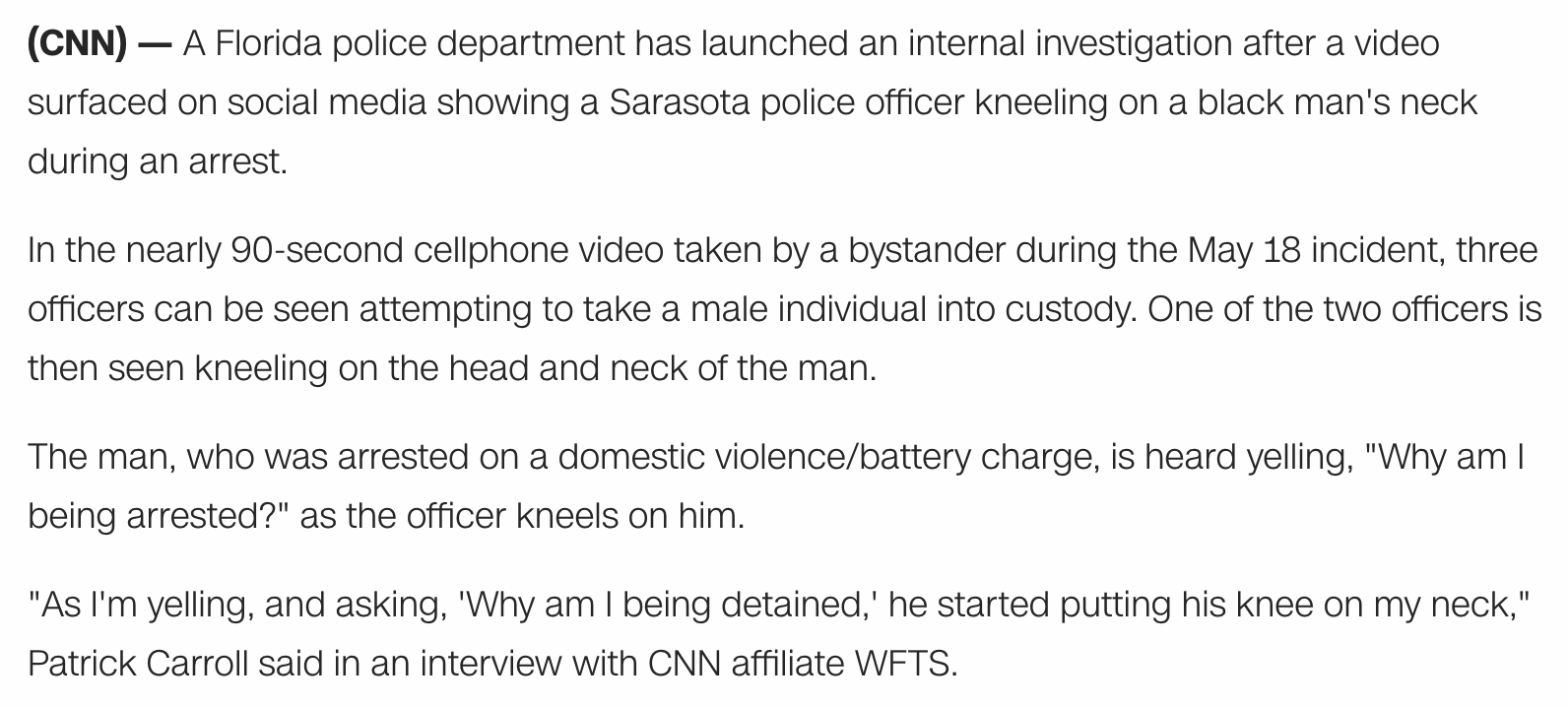 Video captures police officer in Sarasota, Florida kneeling on Patrick Carroll’s neck, May 18, 2020