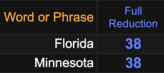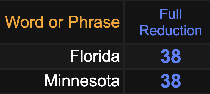 Keep in mind there are four states that sum to 38. They are Florida, Louisiana, Minnesota, and Colorado, with Colorado also being the 38th state in order of statehood.