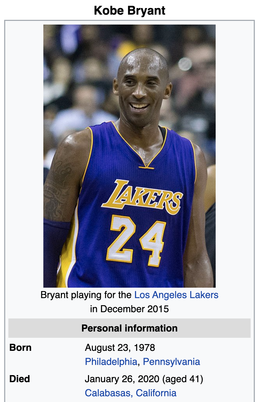 Bryant died on the 26th.
