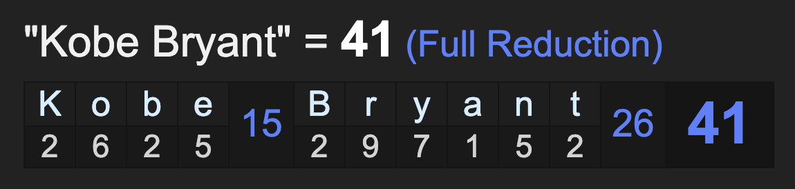 Notice the #41 jersey for Will Smith’s character in the Fresh Prince. Kobe Bryant’s reported date of death, January 26, 2020, came 4-months and 1-day after Will Smith’s birthday, or 123-days. Of course, Kobe was from Philly, and played basketball in L.A., much like Will Smith in The Fresh Prince of Bel-Air, who was from Philadelphia, and got sent to L.A. and Bel-Air. Connecting the 41 piece, is the Gematria of ‘Kobe Bryant’, and the fact that he died at age 41, at least according to the mainstream.
