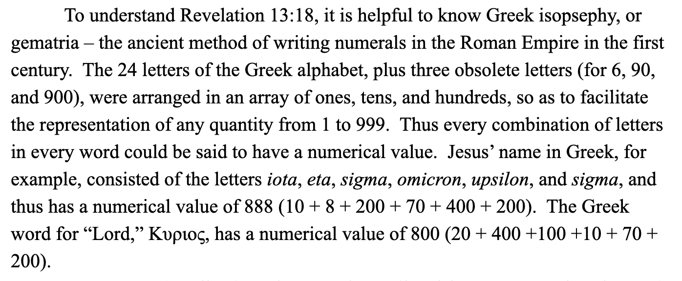 Revelation 13:18, which speaks of 666, number of the beast, number of a man, is a Greek isopsephy riddle.