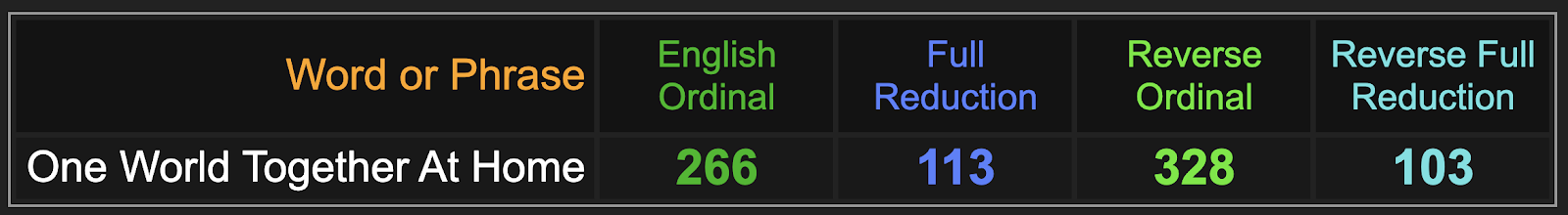 For a bit more gematria on the title of the show, ‘One World Together At Home’…