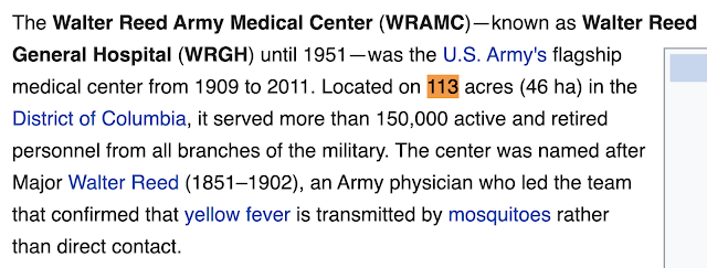 Don’t forget Walter Reed, the military hospital, where they studied infection disease, was on a 113 acre lot, in the city named after the Scottish Rite Freemason, George Washington.